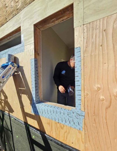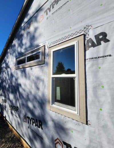 - Typar adhesive tape applied to window flanges, then fully integrated into the house wrap and sealed with tape for a continuous weather barrier